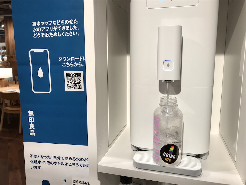 プラスチックごみ削減のため、7月1日より無印良品の店舗内に給水機が設置開始!マイボトルを持参すれば無料で給水できるようになりました。